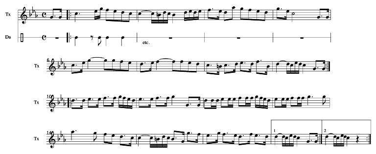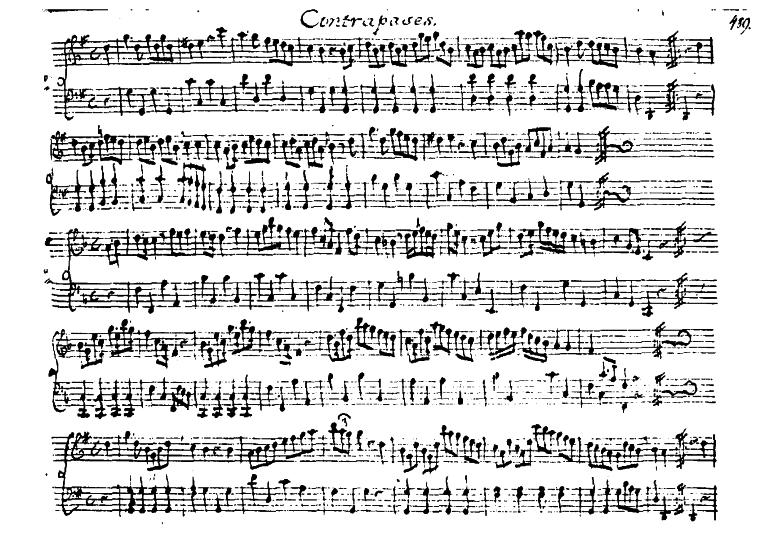 Entre los mencionados ejemplos aparecen cuatro contrapases, y como hemos mencionado, encontramos en ellos las características de la música instrumental de mediados del siglo XVIII. Teniendo en cuenta que estas características debían de ser muy conocidas para el autor del manuscrito, es sorprendente que considerara como propio al contrapás, y la única peculiaridad que le pudo hacer pensarlo es la de su compás de 4/4, aunque desde nuestro punto de vista el argumento parezca bastante débil. Como ocurre muchas veces en esta época con el repertorio de txistu, estos cuatro ejemplos empiezan en la última parte del compás, característica ésta que se mantendrá posteriormente en la mayoría de los contrapases. Estos ejemplos presentan una estructura curiosa: si los zortzikos que aparecen en estos mismos Papeles están escritos para dos txistus, al parecer estos contrapases lo están para un instrumento de tecla, llevando la mano derecha la melodía y la izquierda un acompañamiento muy elemental. He aquí uno de ellos: