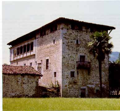 Torre de Oxirando, Gordexola (Bizkaia). Se trata de dos edificios adosados: la torre, gótica (a la derecha), fechable en el siglo XV, y el palacio renacentista, posiblemente del último cuarto del siglo XVI. Fot. Garikoitz Estornés Zubizarreta 1982