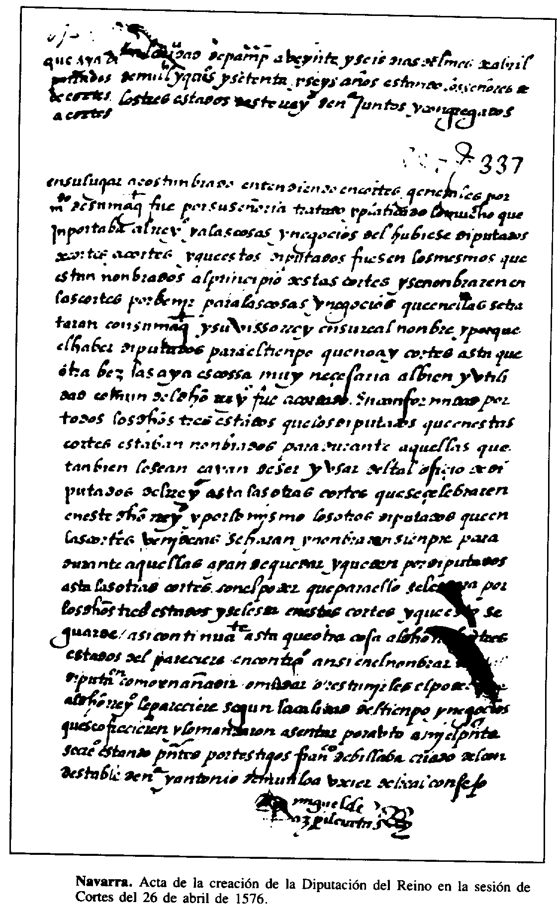 Navarra. Acta de la creación de la Diputación del Reino en la sesión de Cortes del 26 de abril de 1576.