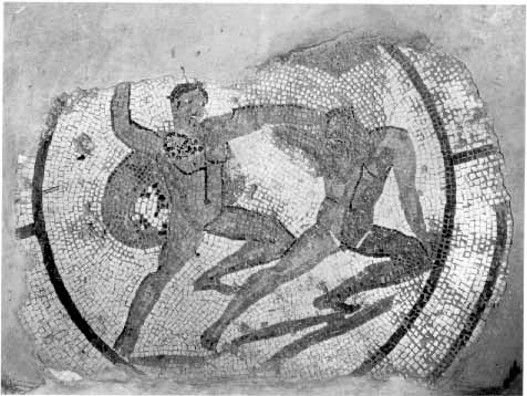 Navarra. Mosaico polícromo romano hallado en la calle Navarrería, de Pamplona / Iruña. Representa la lucha de Teseo contra el Minotauro dentro del laberinto. Fechable en el siglo II. Se conserva en el Museo de Navarra. Fot. Mas.