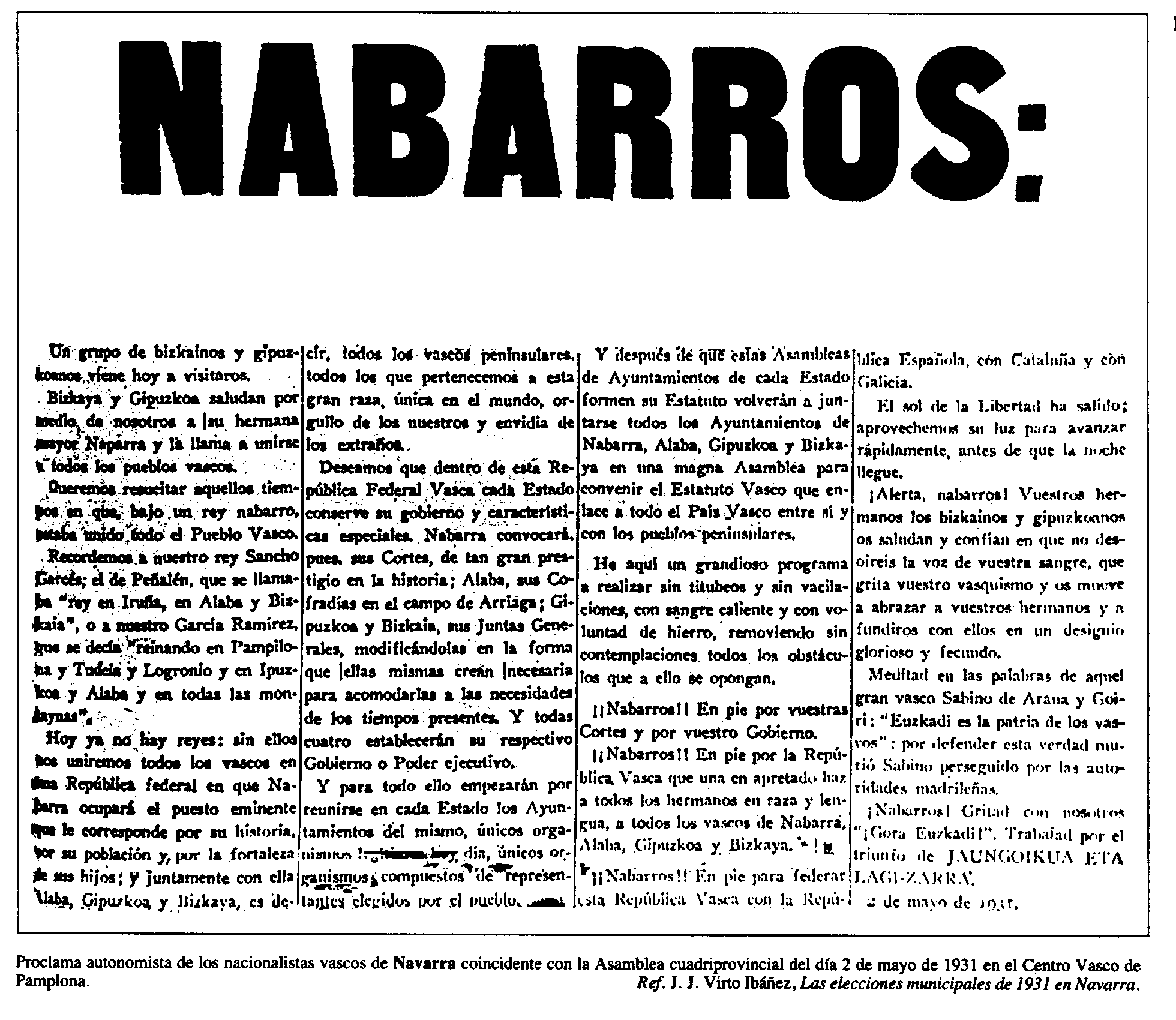 Proclama autonomista de los nacionalistas vascos de Navarra coincidente con la Asamblea cuadriprovincial del día 2 de mayo de 1931 en el Centro Vasco de Pamplona. Ref. J.J. Virto Ibáñez, Las elecciones municipales del 1931 en Navarra