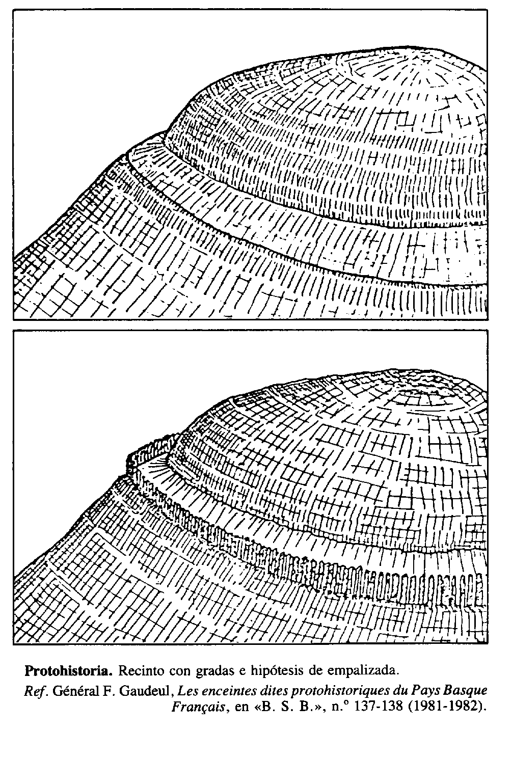 Protohistoria. Recinto con gradas e hipótesis de empalizada. Ref. Général F. Gaudeul, Les enceintes dites protohistoriques du Pays Basque. Français, en Bulletin de la Société des Sciences, Lettres, Arts et d'Études Régionales de Bayonne, n.º 137-138 (1981-1982)