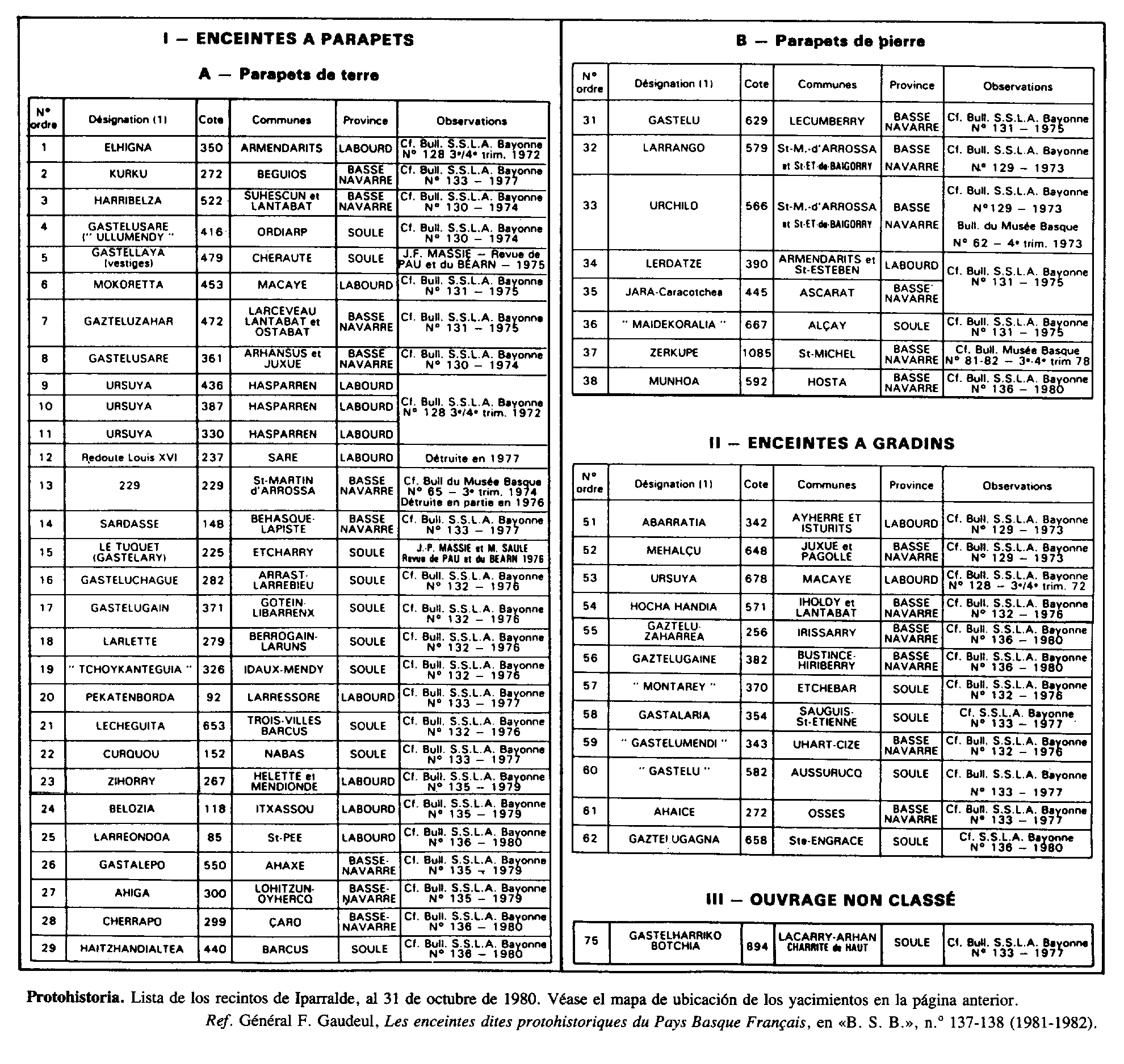 Protohistoria. Lista de los recintos de Iparralde, al 31 de octubre de 1980. Véase el mapa de ubicación de los yacimientos en la imagen anterior. Ref. Général F. Gaudeul, Les enceintes dites protohistoriques du Pays Basque Français, en Bulletin de la Société des Sciences, Lettres, Arts et d'Études Régionales de Bayonne, n.º 137-138 (1981-1982)