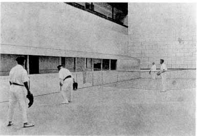 Pelota. Trinquete moderno de Bayona. Saque en el juego de Pasaka. Foto del primer tercio del siglo XX. Ref. E. Blazy, La pelote basque