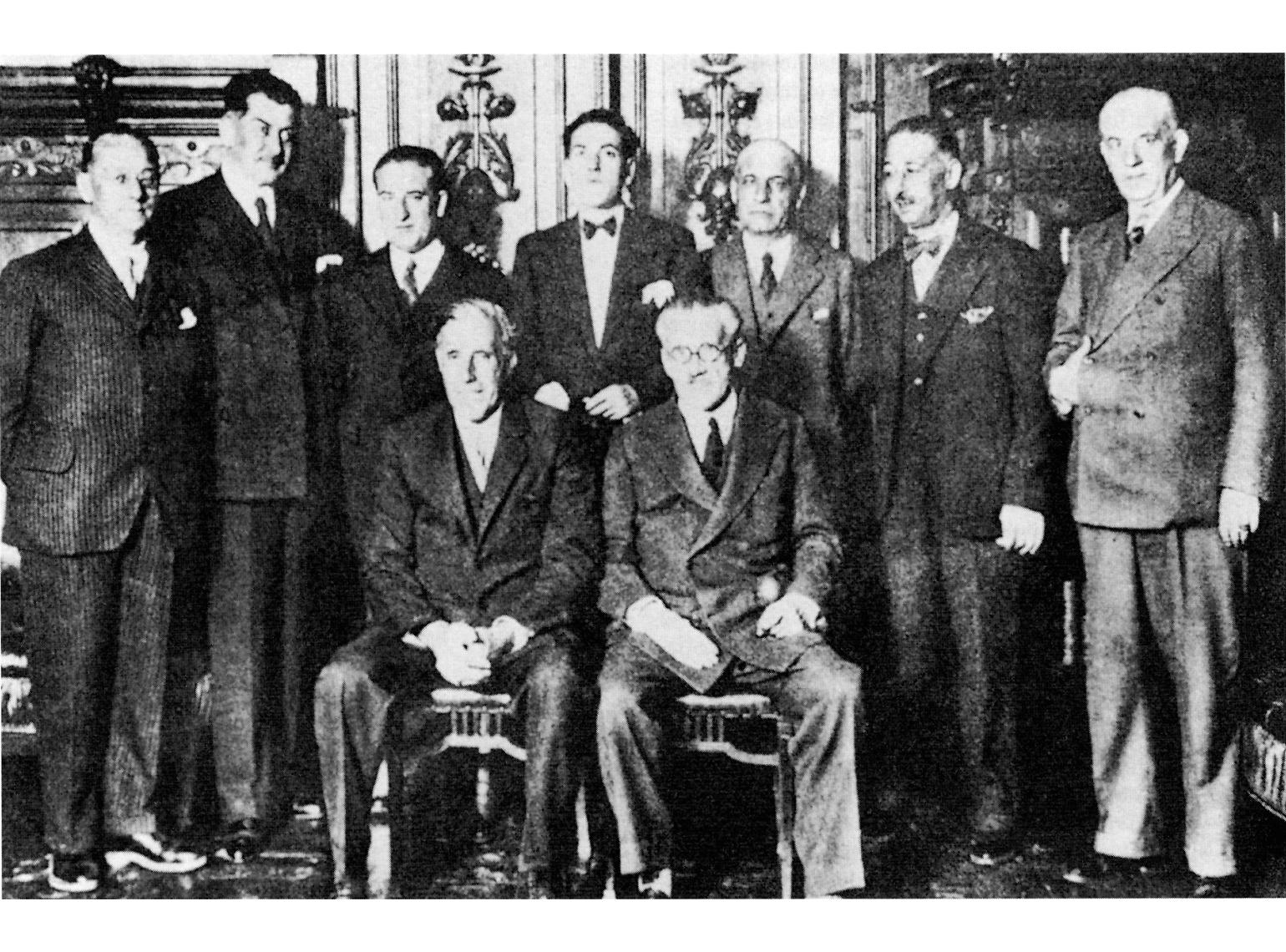 El presidente de las Cortes de la segunda República, Julián Besteiro, con jefes de las minorías parlamentarias. De izquierda a derecha y de pie: Giral, Rafael Guerra del Río, Ruiz del Río, Juan Simeón Vidarte Franco, José Ortega y Gasset, Luis Companys Jover, Joaquín Beunza Redín; sentados: Julián Besteiro, José Franch y Roca