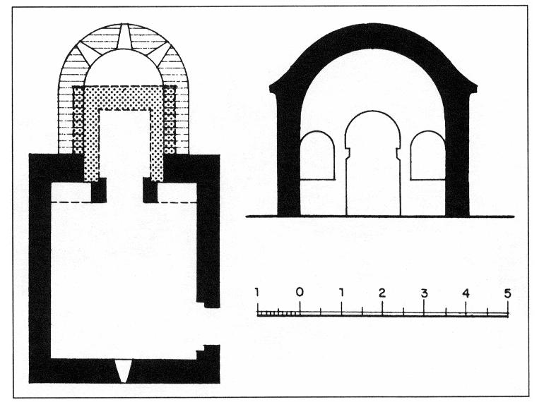 Planta y sección de la ermita de San Esteban de Viguera (Rioja). Ref. José Esteban Uranga Galdeano y Francisco Íñiguez Almech, Arte medieval navarro. Volumen primero. Arte prerrománico