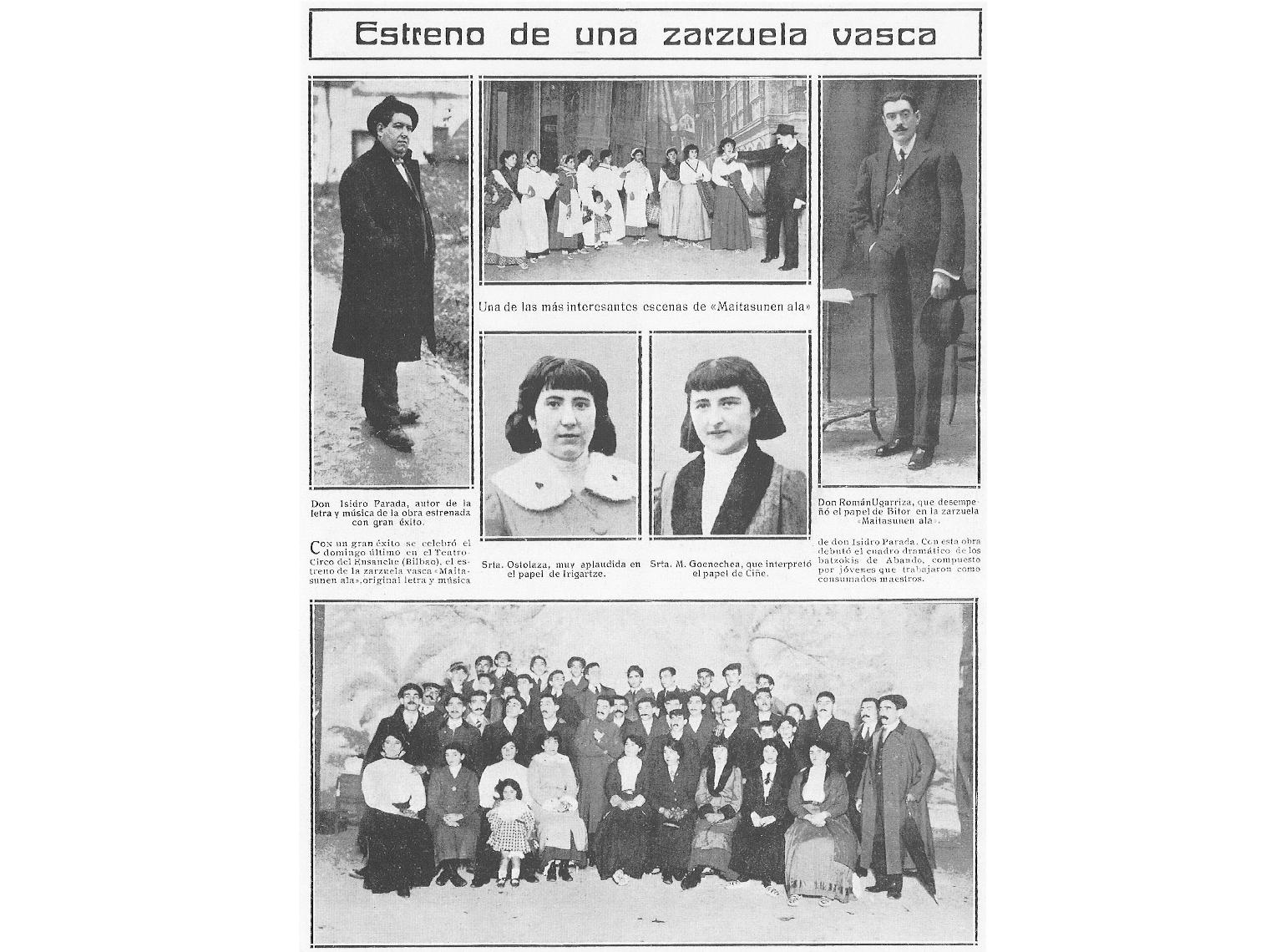 Reseña publicada por el dominical Novedades del estreno en el Teatro Circo del Ensanche, en Bilbao, de la zarzuela vasca "Maitasunen ala". 18 de diciembre de 1910.