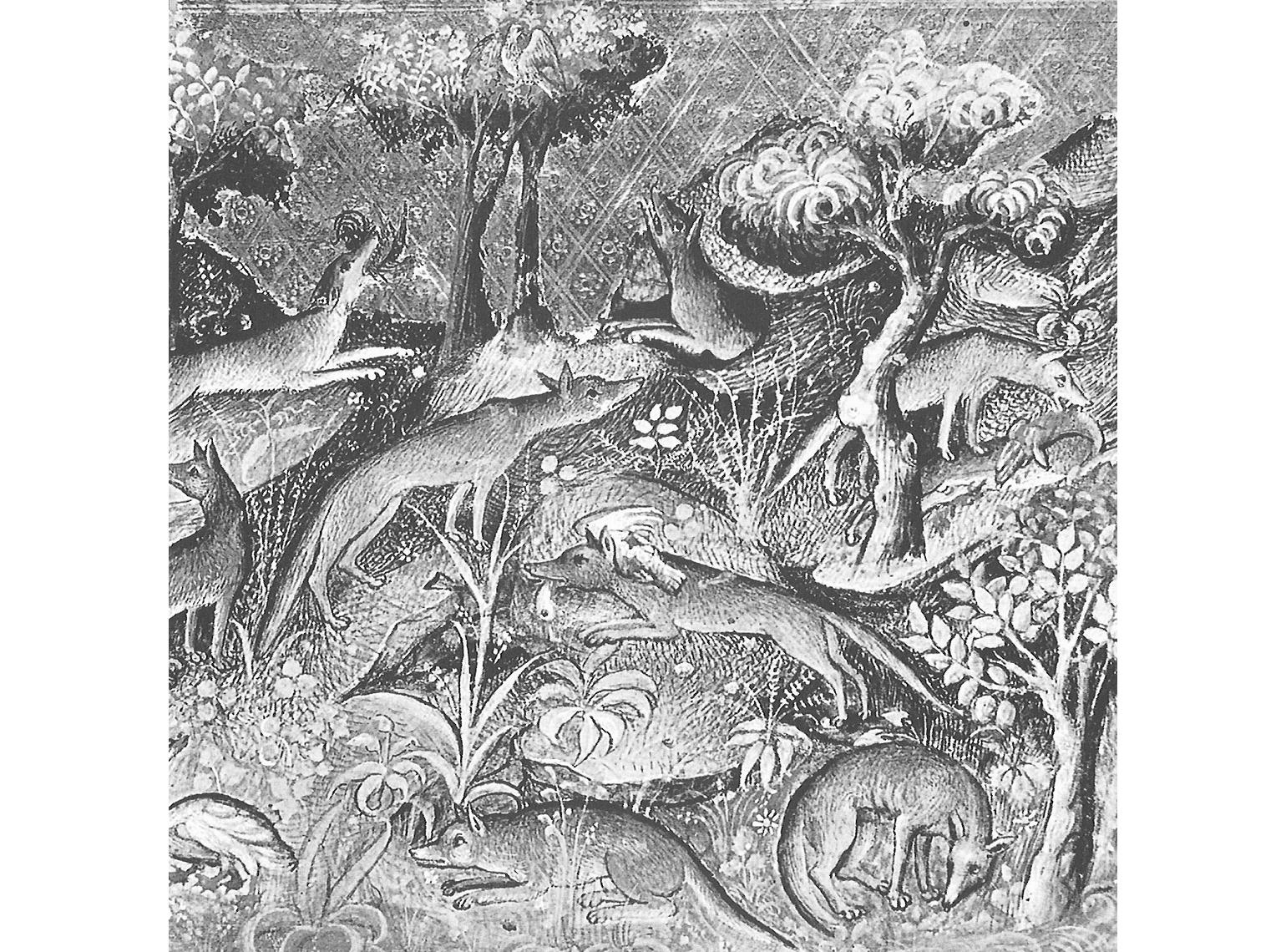 Actividad cazadora del zorro, en una miniatura de la obra Les deduictz de chasse, de Gastón Febo. Año 1387. Bibl. Nac. de París.
