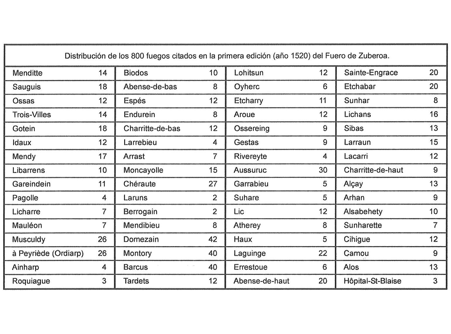 Distribución de los 800 fuegos citados en la primera edición (año 1520) del Fuero de Zuberoa.