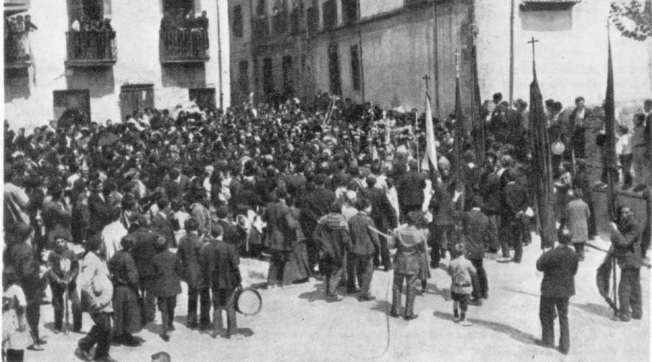 Los habitantes de Arrastaria (Bizkaia) siendo despedidos a la salida de Orduña (Bizkaia) tras la procesión al santuario de la Virgen de la Antigua en las fiestas de Orduña, 8 de mayo de 1913