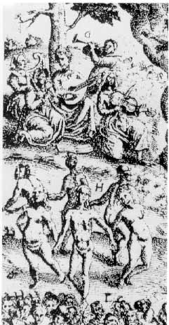 Música. Grupo de músicos y danzantes en el grabado que acompaña la obra de Pierre de Lancre Tableau de l'inconstance et l'instabilité de toutes choses..., París, 1607