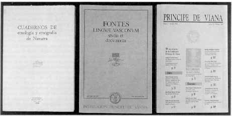 Portada de varias publicacione: Cuadernos de etnología y etnografía de Navarra, Fontes Lingvae Vasconum y Príncipe de Viana