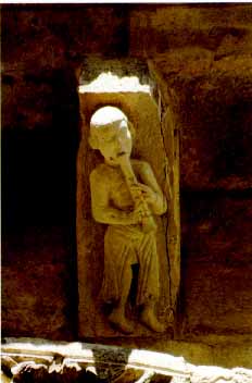 Navarra. Músico representado en un canecillo sobre la portada de la iglesia románica de la Magdalena, en Tudela. Segunda mitad del siglo XII. Fot. Garikoitz Estornés Zubizarreta, 1991