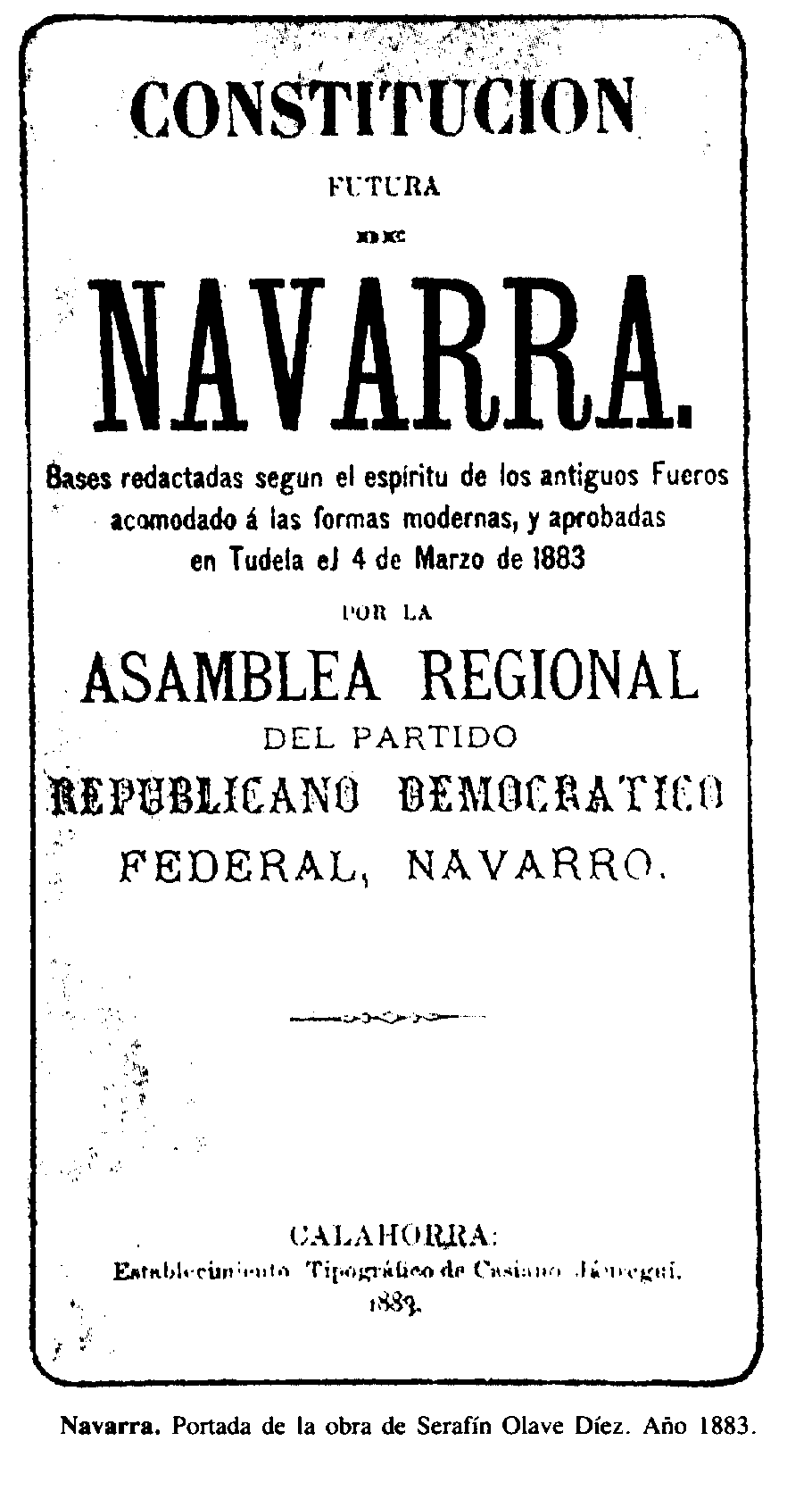 Navarra. Portada de la obra de Serafín Olave Díez. Año 1883