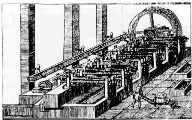 Elaboración del papel. Batán donde se produce la pasta de papel y mediante un chorro continuo de agua se refina. El grabado corresponde al método aplicado en la fábrica de Alejandro de Aldecoa, en Legazpi (Gipuzkoa)