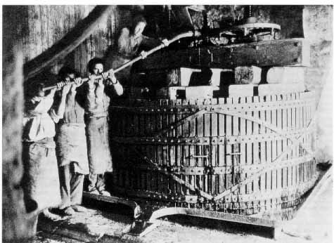Prensa. Prensado de la uva en las bodegas del Marqués del Riscal, en Elciego (Álava), hacia 1880. Ref. E. Sáenz de San Pedro, V. del Val y J. Vidal, Álava ayer