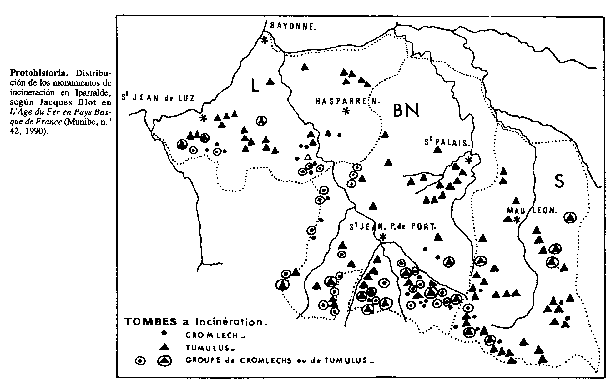 Protohistoria. Distribución de los monumentos de incineración en Iparralde, según Jacques Blot en L'Age du Fer en pays Basque de France (Munibe, n.º 42, 1990)