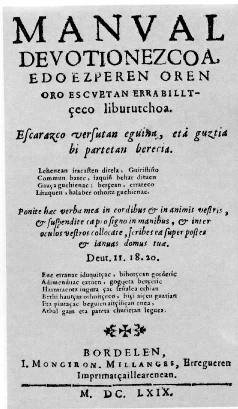 Literatura. Portada del Manual Devotionezcoa de Ioannes Etcheberri. Año 1669