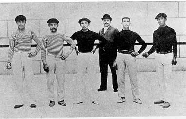 Pelota. De izquierda a derecha: Larre "Ciki" de Urruña; Etchechoury; Larrañaga, de Azkoitia; ?; Soudre "Goñi"; Salaberry. Partido a mano en el trinquete de Saint Palais (Baja Navarra), 3 de junio de 1895