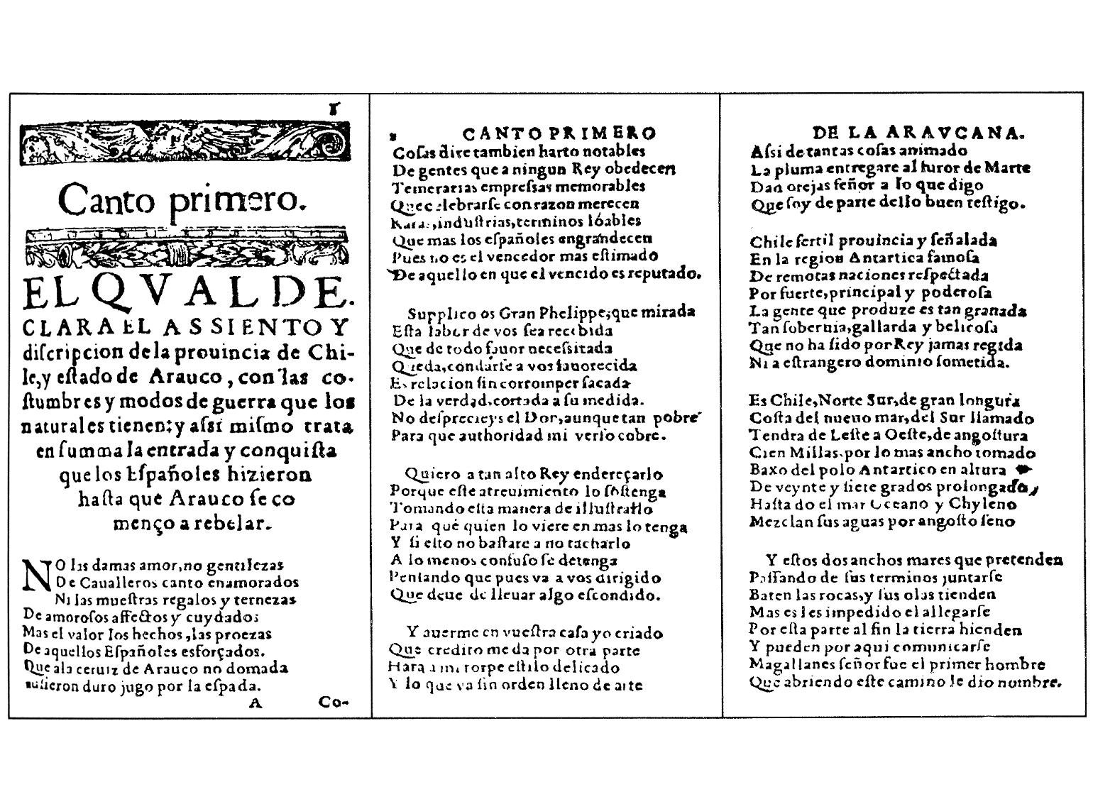Fragmento del canto primero de La Araucana, de Alonso de Ercilla y Zuñiga. Edición de Zaragoza, año 1577. Biblioteca de la Diputación Foral de Bizkaia