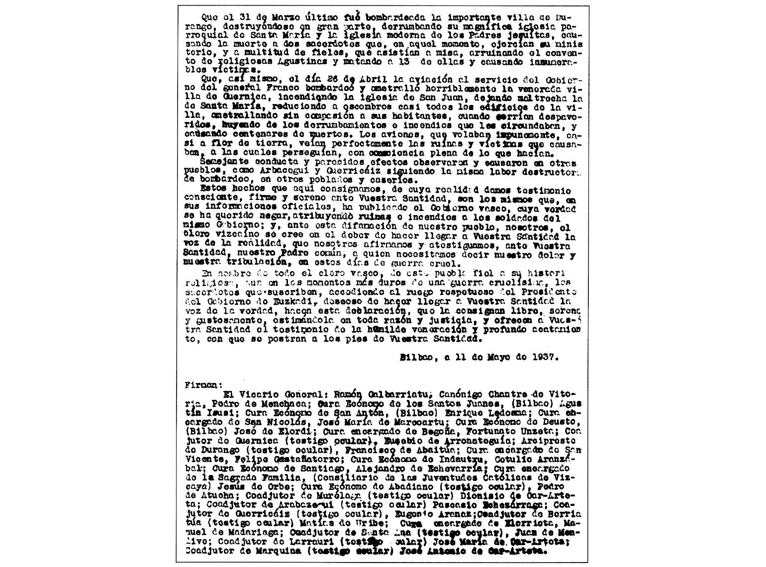 Vizcaya / Bizkaia. Fragmento de una carta dirigida al Papa por el clero de Bizkaia el 11 de mayo de 1937