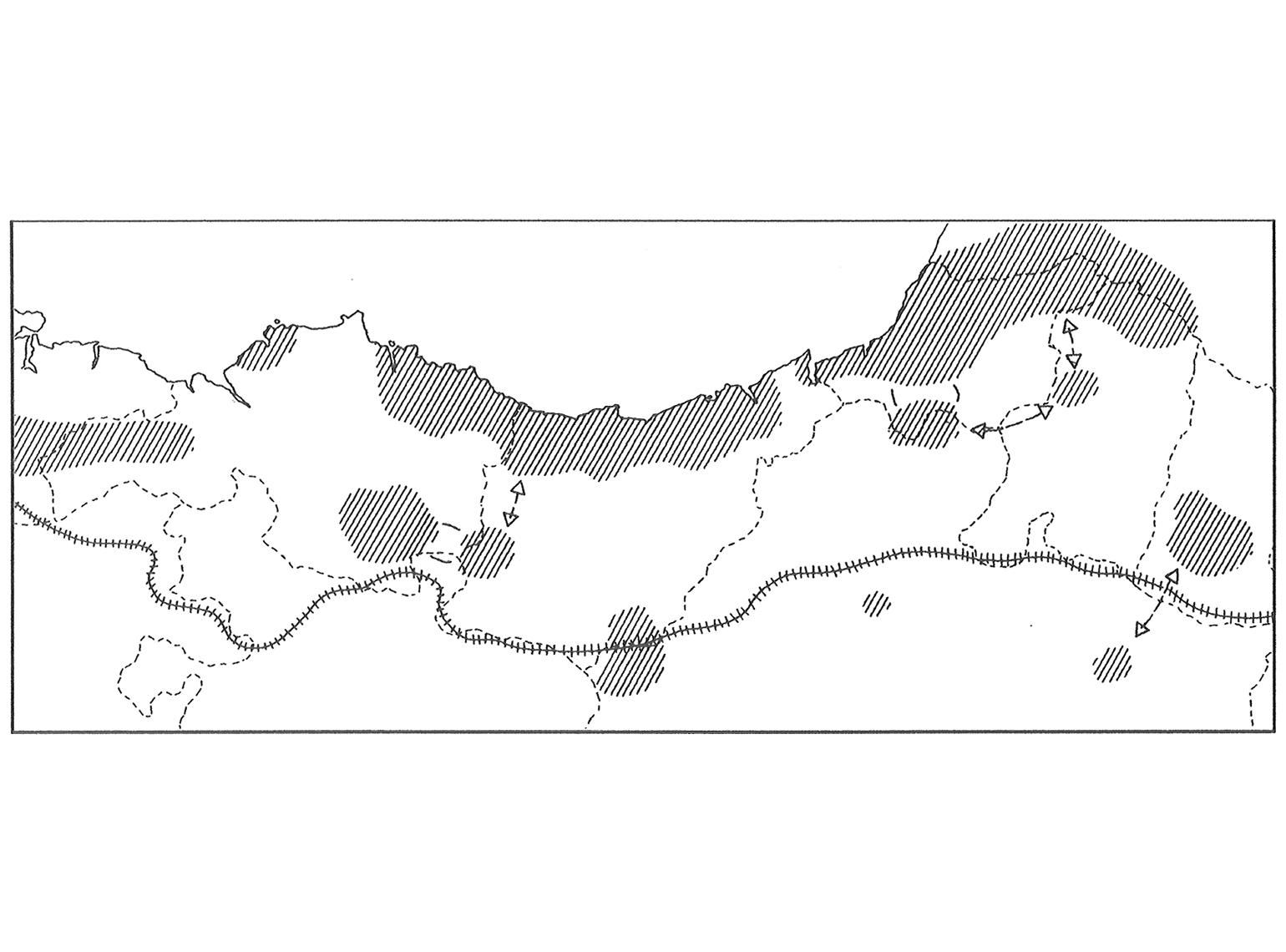 Areas de dispersión de yacimientos vascos del Paleolítico Superior y del Epipaleolítico; se indica la divisoria entre las cuencas atlántica y mediterránea. Zuberoa, en el extremo derecho.