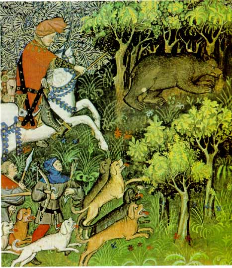 Caza del oso, según miniatura de la obra Les deduictz de chasse de Gastón Febo. Año 1387. Biblioteca Nacional de París