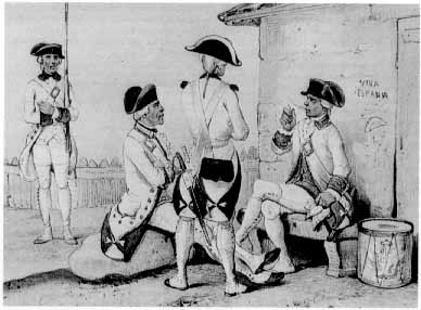 Uniformes militares de Navarra en 1779, según grabado del Album de infantería de Clonard (s. XVIII). Ref. María Elena de Arizmendi Amiel, Vascos y trajes