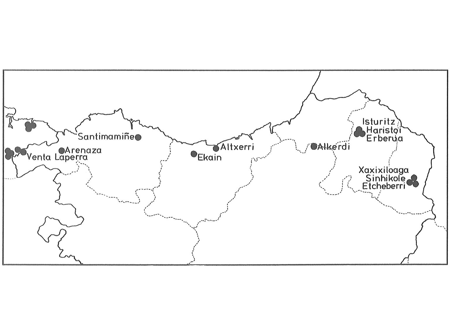 Mapa del arte rupestre paleolítico en Euskal Herria, indicándose los sitios inmediatos en el Este de Cantabria. Zuberoa, en el extremo derecho.