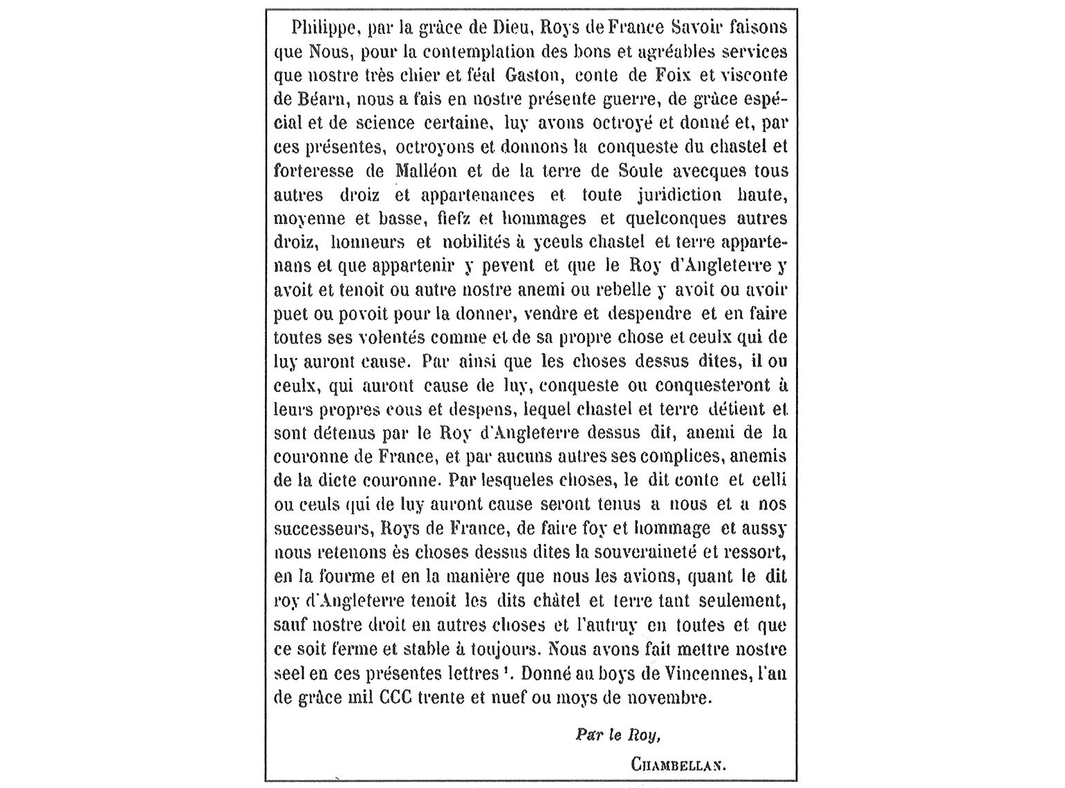 Felipe VI, rey de Francia, da Zuberoa y el castillo de Mauléon al vizconde de Béarn Gastón II. Documento fechado en Vincennes en noviembre de 1339 (Arch. Basses-Pyrénées, E. 355).