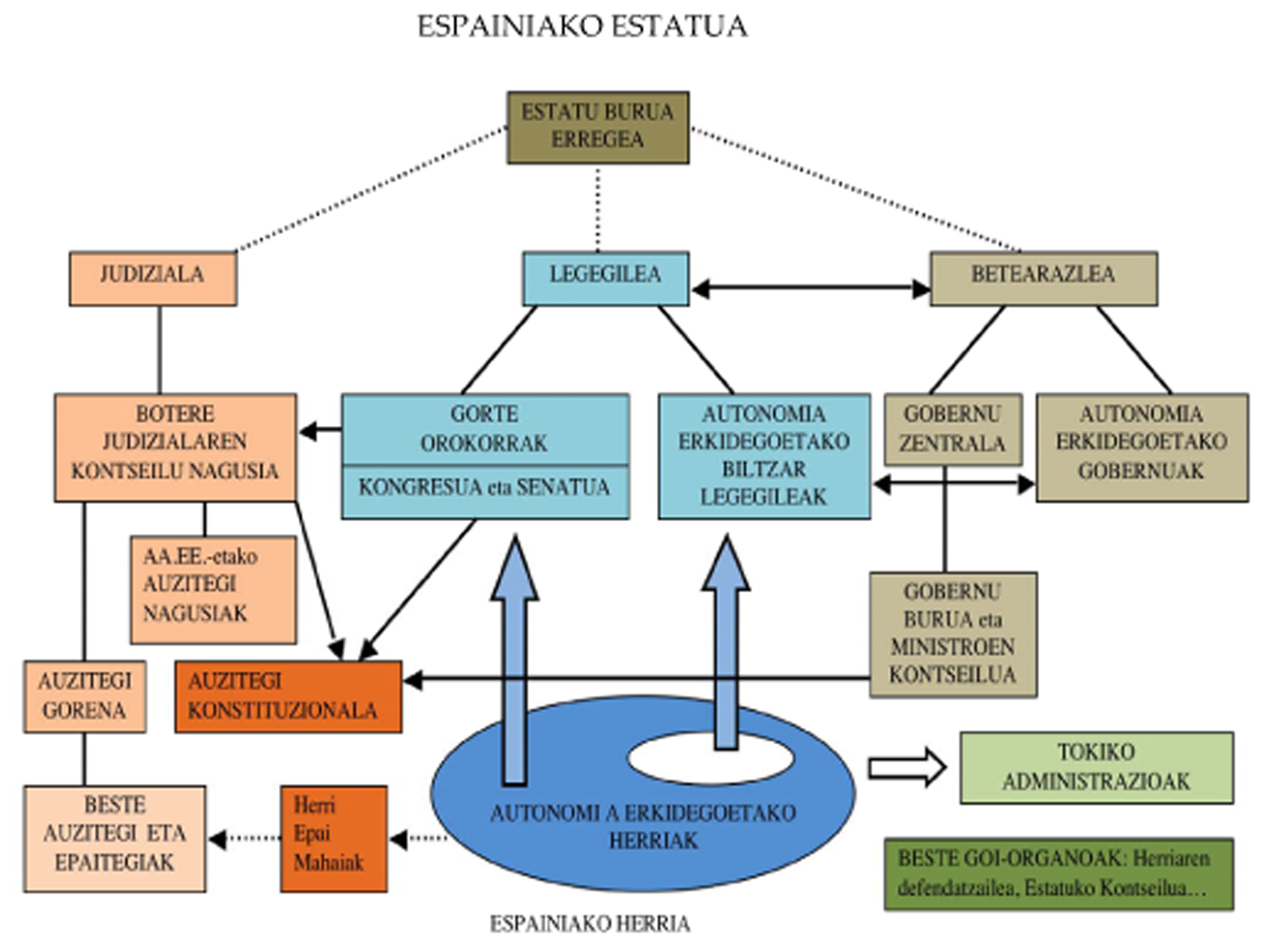 Bestetik, 1978ko Konstituzioak zuzenbidezko estatu demokratiko gisa definitzen du Espainia. Honela, nazio-subiranotasunak herri espainiarrean du egoitza eta horretatik sortzen dira Estatuaren botere guztiak. (1.2 art.) Baina, aldi berean, gerraostean berreraikitako Europan salbuespena den gobernu mota bat ezartzen du, Monarkia parlamentarioa, alegia (1.3 art.). Forma politiko horrek, gainera, 1947tik aurrera Estatu frankistak bere egindako forma politikoaren -Espainiako Erreinua-, eta Francok 1969an Juan Carlos I.a Borboikoa oinordetzarako hautatu izanaren jarraipena suposatzen du. Behin alderdi sozialista eta komunista nagusien aldarrikapen errepublikarra baztertuta, Francok ezarritako eta 1978ko Konstituzioak demokraziarako berreskuratutako monarkia blindatuta geratu zen, Koroari buruzko auzitan konstituzio erreformako prozedura larriagotua ezarri baitzen.