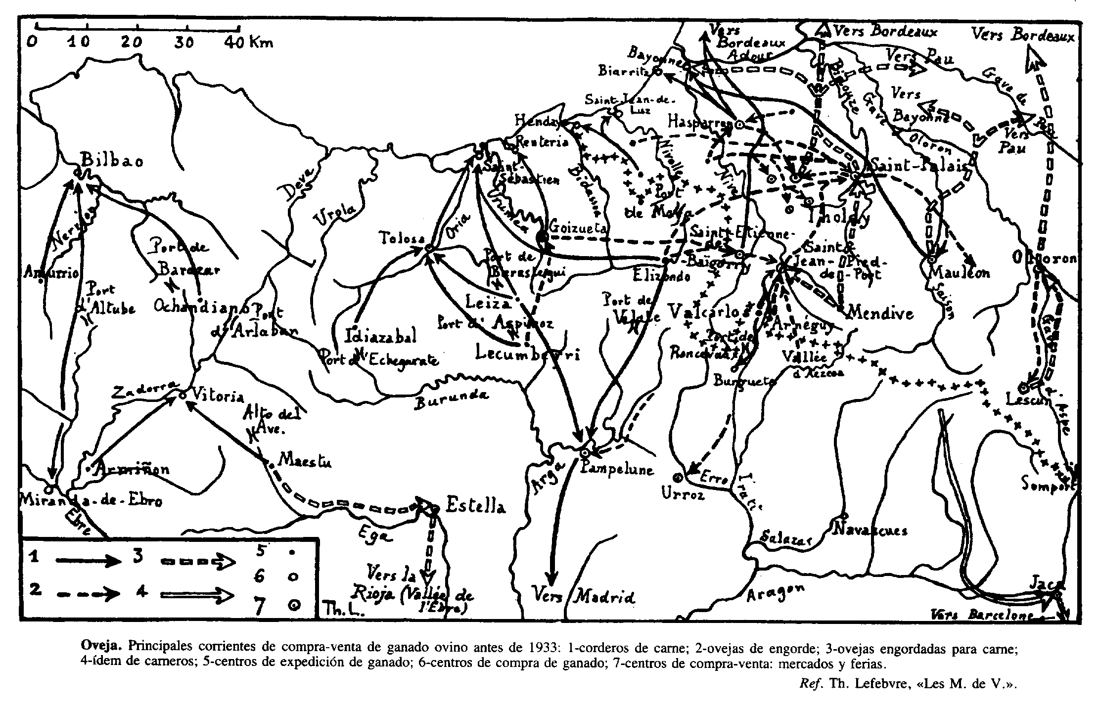 Oveja. Principales corrientes de compra-venta de ganado ovino antes de 1933: 1-coderos de carne; 2-ovejas de engorde; 3-ovejas engordadas para carne; 4-ídem de carneros; 5-centros de expedición de ganado; 6-centros de compra de ganado; 7-centros de compra-venta: mercados y ferias. Ref. Th. Lefebvre, "Les modes de vie dans les Pyrénées Atlantiques Orientales"