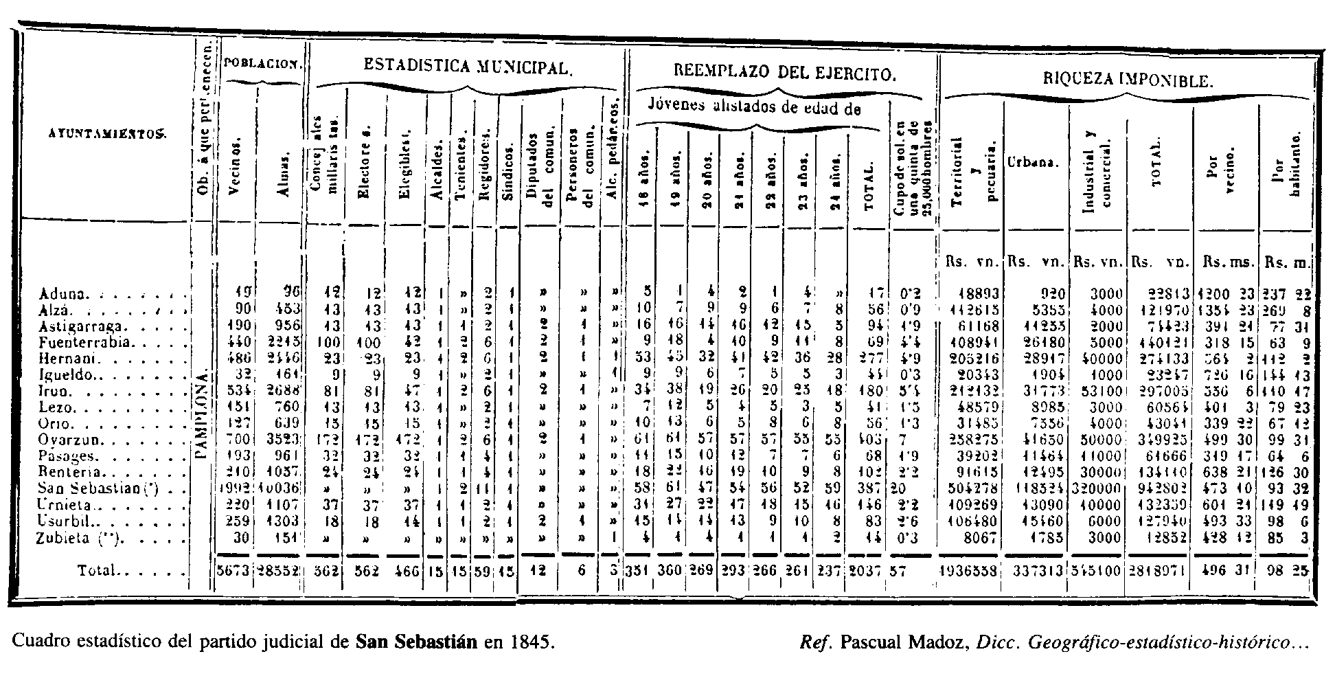 Cuadro estadístico del partido judicial de San Sebastián en 1845. Ref. Pascual Madoz, Diccionario Geográfico-estadístico-histórico