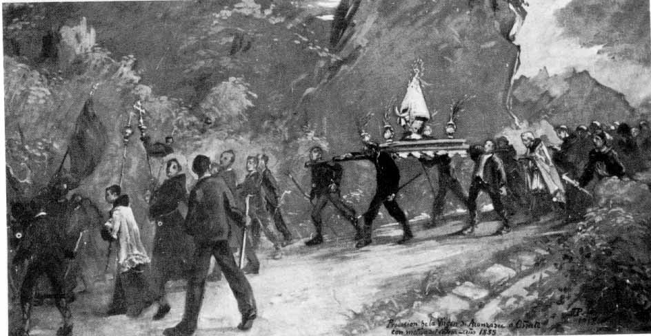 Fiesta. Procesión de la Virgen de Aranztazu a Oñati con motivo de la epidemia de cólera en el año 1835. Óleo de Pablo Uranga del año 1918
