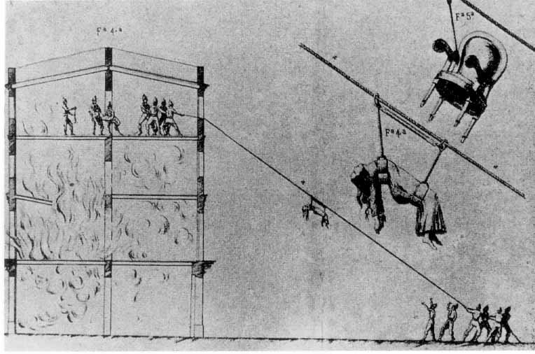 Aparato Rovira, para el salvamento de personas y mobiliario en los incendios. Grabado de la Memoria de los estudios practicados en la Exposición de París de 1867, por encargo del Iltre. Ayuntamiento de la Ciudad de Vitoria, obra del arquitecto Julio de Saracibar. Ref. Emilio de Apraiz, Algo más sobre los arquitectos Saracibar , «Vida Vasca», 1952