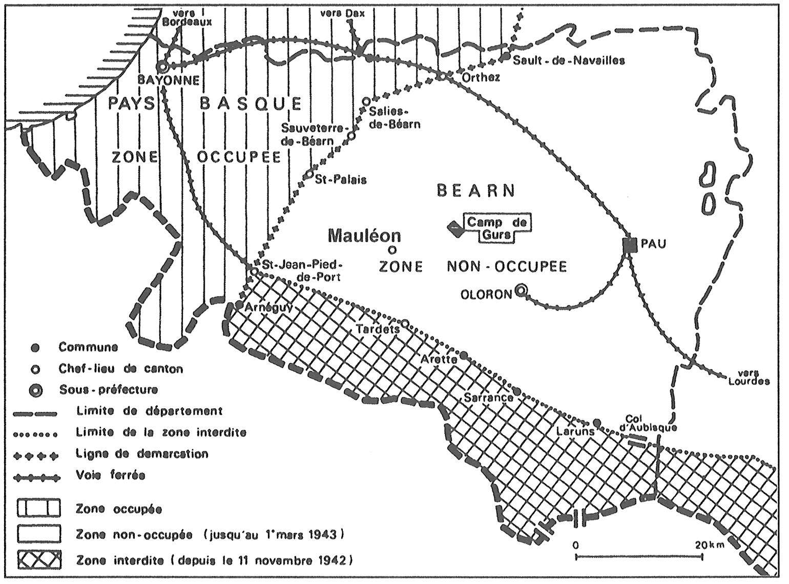 Situación de Zuberoa y del conjunto del departamento de Basses-Pyrénées en el período 1940-1944. Obsérvese la proximidad al territorio suletino del campo de concentración de Gurs, situado entre L'Hôpital-St-Blaise y Navarrenx, donde fueron internados, entre otros, 6.555 vascos entre el 5 de abril de 1939 y el 31 de agosto del mismo año. Ref. Claude Labarie, Le Camp de Gurs, 1993.