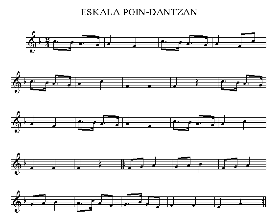 Musicalmente se compone de dos frases musicales de ocho compases en 2/4. La primera de ellas, tal y como dice Francisco Arrarás en su libro, recuerdan a algunas frases de la mutil-dantza denominada hiru puntukoa.