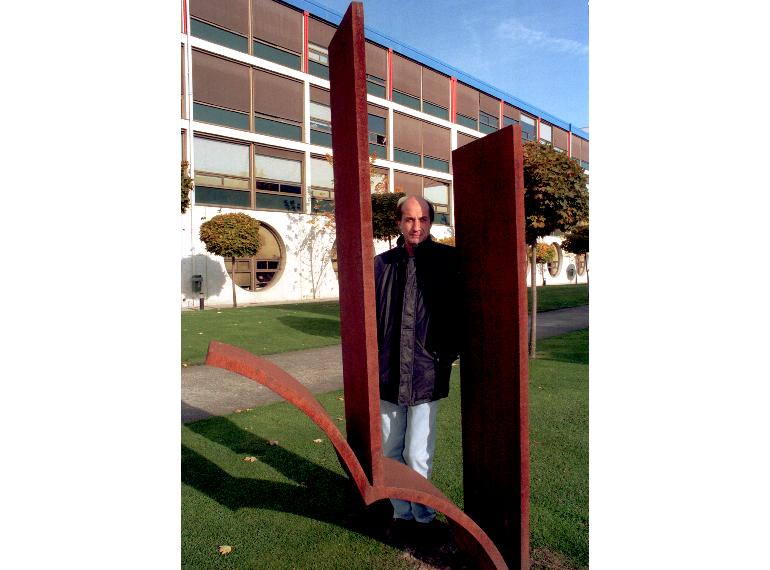 Posa junto a su escultura Sin un final en el campus de la Universidad Pública de Navarra. Foto Juan Miguel Ochoa de Olza, noviembre 2000
